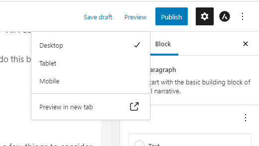 To begin, click the “Preview” icon in the upper right. Then select the device type to see a preview of the post on your computer, tablet, or mobile phone. We went with “Desktop” for this one. To finish, select “Preview in a new tab.”